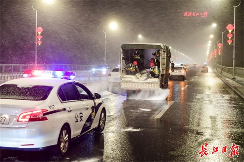 警车前后“护航”洒盐车在武汉长江二桥上作业。 长江日报记者 史伟 摄