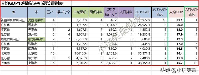 一、中国大陆人均GDP10强城市人口、面积、GDP总量、人均GDP排名(详见下表)