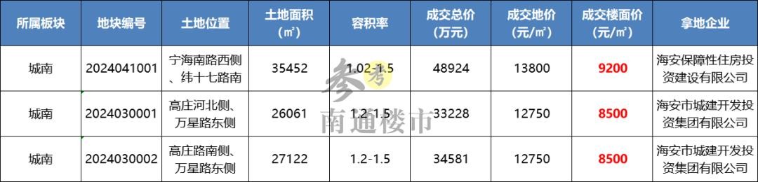 2024041001地块位于海安南屏幼儿园南侧,土地面积35452㎡,容积率1.02-1.5,由海安保障性住房投资建设有限公司摘牌,拿地楼面价约9200元/㎡。