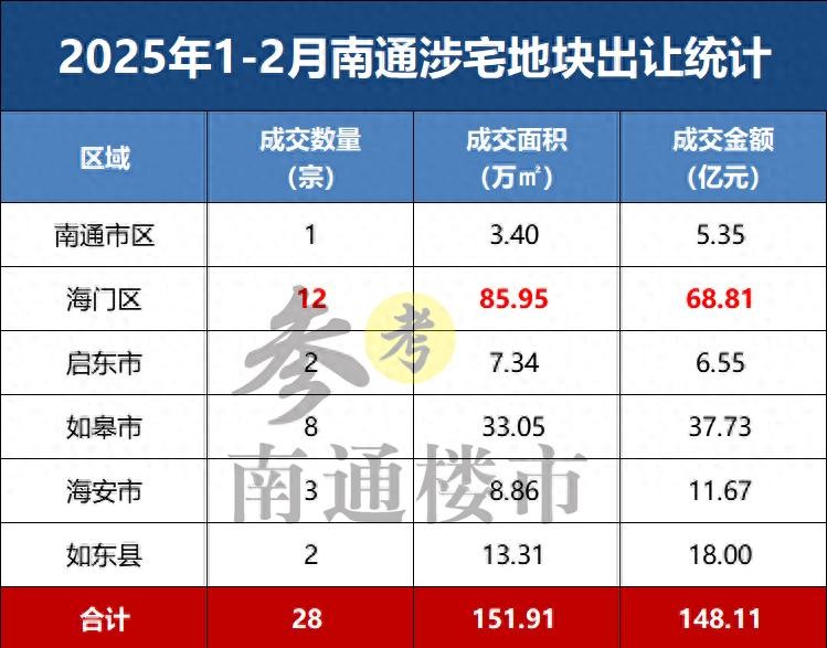 据不完全统计,2025年1-2月南通大市共计挂牌29宗涉宅地块,其中28宗成功出让,1宗流拍,共计出让土地面积约152万㎡,卖地总收入约148亿元。