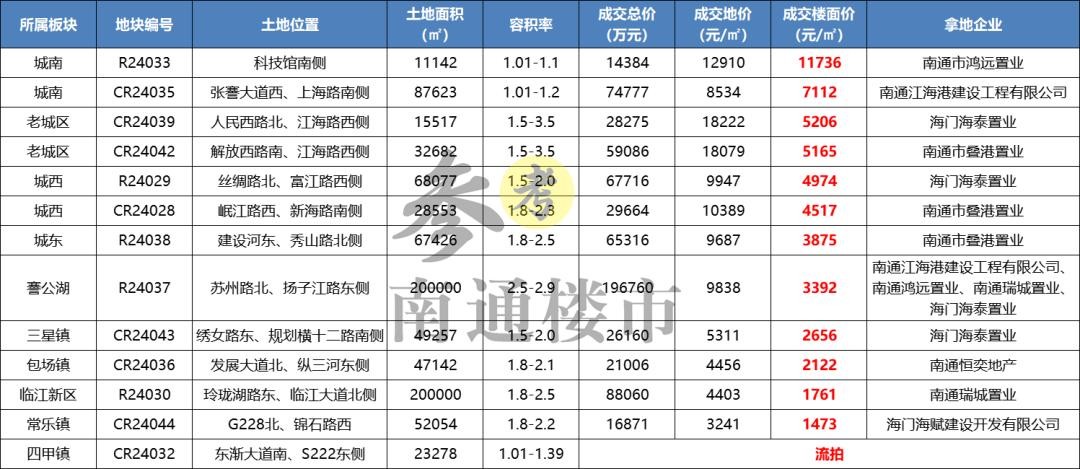 海门挂牌13宗涉宅地块,其中四甲镇1宗商住地流拍,其余均由本地国资摘牌,合计土地面积约85.95万㎡,拿地总金额约68.81亿元。