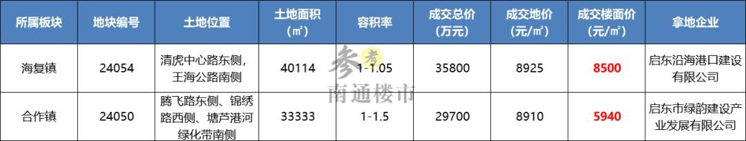 启东成功出让2宗涉宅地块,1宗位于海复镇,1宗位于合作镇,合计土地面积约7.34万㎡,拿地总金额约6.55亿元。