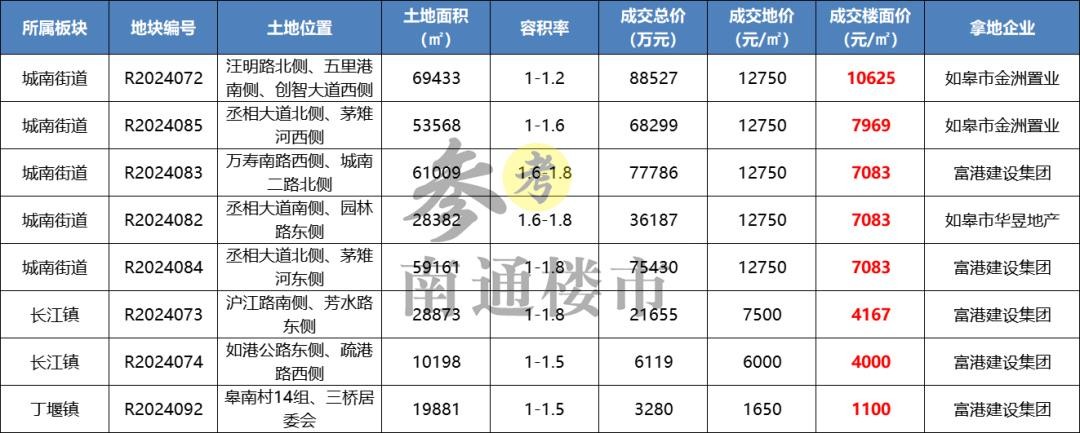 该地块位于汪明路北侧、五里港南侧、创智大道西侧,土地面积69433㎡,容积率1-1.2,由如皋金洲置业摘牌,拿地楼面价约10625元/㎡。