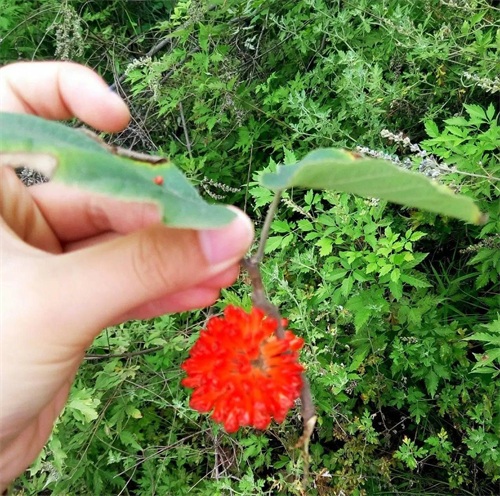上午的10点左右,我们从小路向上爬,在停车场就看到一棵构树,上边还结了果实,红彤彤的。小时候经常能看到这样的果实,但现在已经不太常见了。