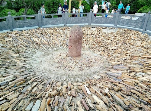 正对着大门的是一个圆形的头坑,中间的石头上写着「天心」两个字。天心石意味着始祖山位于天地之中心,中原之中心。