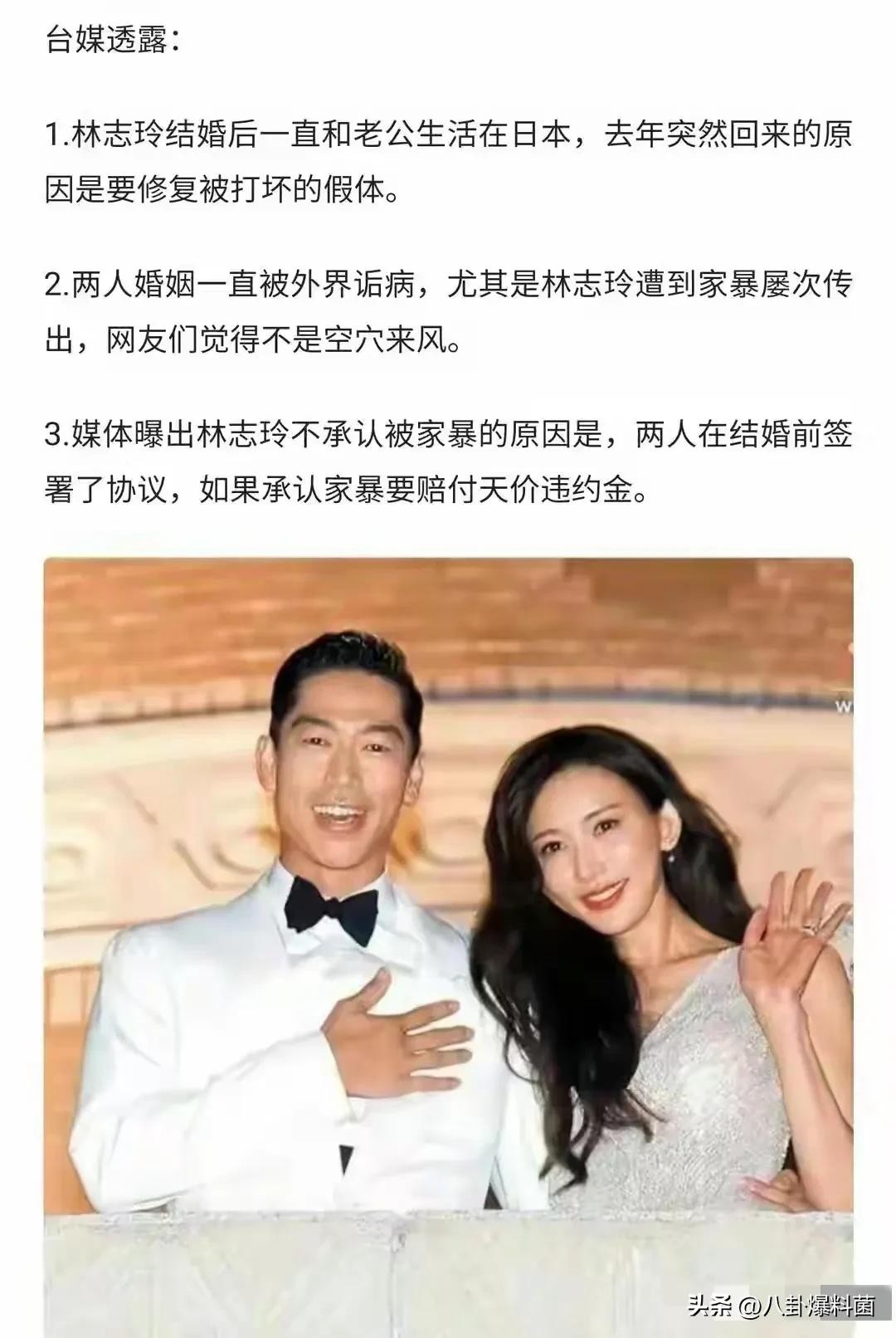 婚后仅一年时间,林志玲就频频传出被家暴的消息,甚至传出身上假体被打出,低调返台修复的消息。