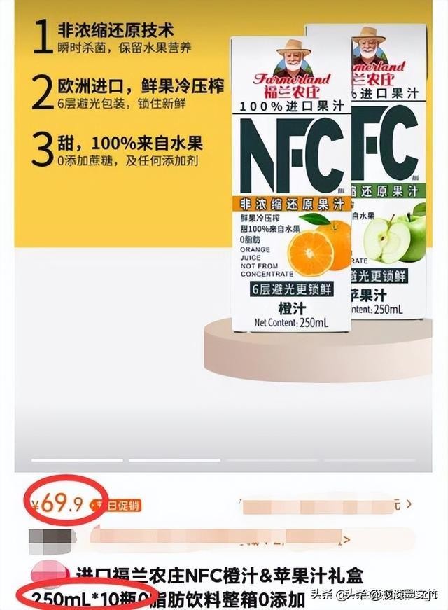 这款果汁的网上售价为10瓶69元,也就是说大瓶只需6元。