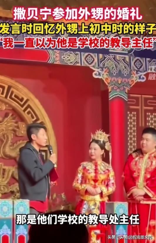 随后,撒贝宁开始取笑新郎,并讲述他表弟童年的有趣故事。撒贝宁说,他的表弟从小就有点胖。五年级时,撒贝宁去表弟的学校发表演讲。他的表弟坐在观众席上,看起来很胖。 “我一直以为他是学校的院长。”