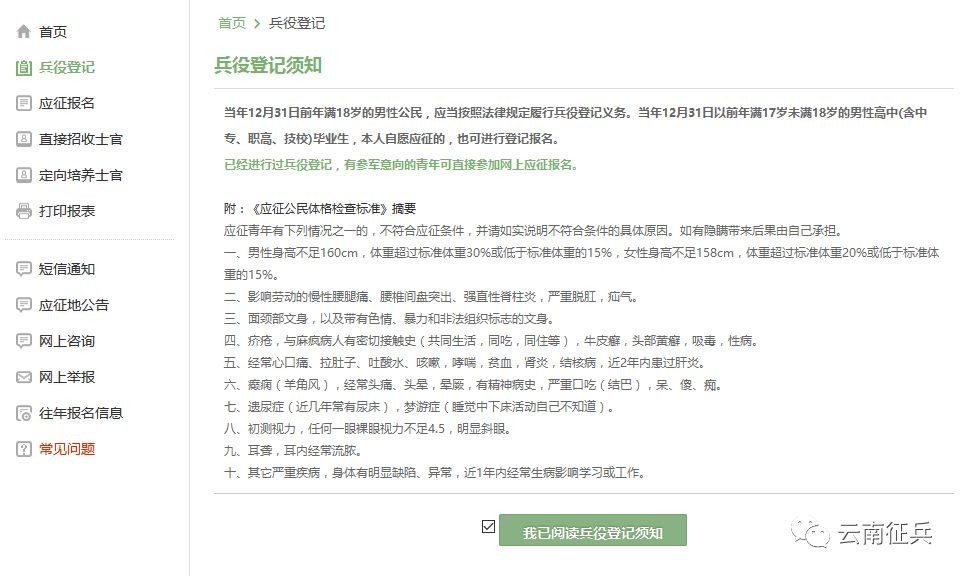 开始报名你会发现跟所有的软件安装一样,会让你阅读一大篇的使用说明。小编十分不建议你跟安装软件一样,直接点确定。在这个时候请详细阅读 详细阅读 详细阅读(重说三)兵役登记须知。了解自己的各方面情况是否达标,这能避免后续工作出现的很多麻烦哦!