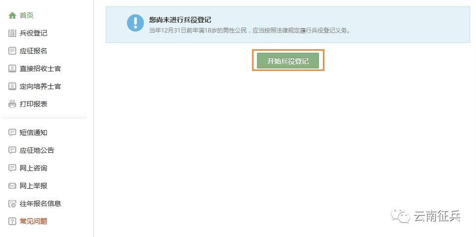 登录系统以后,点击右侧的“开始兵役登记”进行报名工作啦!