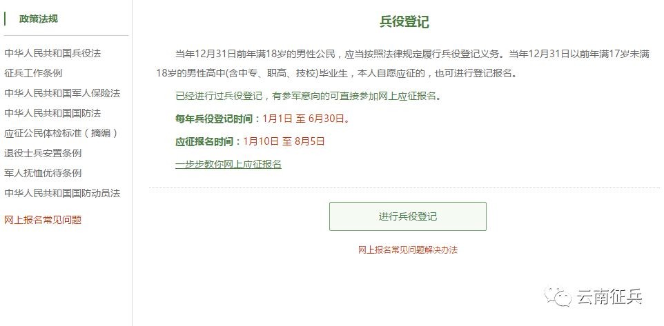 在全国征兵网(https://www.gfbzb.gov.cn/)首页右侧,点击“兵役登记(男兵)”。云南征兵特别提醒:女生不用进行兵役登记,有参军意愿的等下一步网上报名开始后(去年是6月25日)直接点下面的“应征报名(女兵)”就可以了。