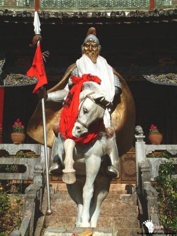 三朵是一个中年的战将形象。两旁供他的白族和藏族两位夫人,传说是藏、纳、白三个民族的和亲制产物。正殿两边是耳房。大门是一座门楼的中间一间。两旁分别供三朵神的七匹战马。里门也是门楼,但中间一门长年关闭,只有木氏亲族才能从正门出入,木氏亲族在三朵神前拜而不跪。因为三朵只是纳西族的将军,而木氏是王爷。、后来阿布高堆去世,纳西民众为了纪念他,把他的塑像供奉在三朵殿内的西侧。他赤脚、腰微驼,身披毛毡,手持捐杖,脸上布满沧桑的皱纹,但双眼炯炯有神,注视前方……是一个地道的纳西族牧民形象。万众敬仰的战神后来南诏国王封玉龙山为北岳,从那时起三朵庙也叫北岳庙,当然那时是纳西王向南方强大的大理白族王国称臣的年代,之前也向西北强大的吐蕃称臣过。也就是说大宋朝之前纳西族地区受南诏、吐蕃等大势力的轮流控制。公元1253年元世祖忽必烈亲率中路军,南征大理国,逐鹿中原,途经丽江。深受纳西族土王木氏和民众的欢迎及支持,忽必烈大喜之余,封玉龙雪山为“大圣北岳定国安邦景帝”。十年后封木氏为元朝丽江的世袭土司,这是对土王木氏识时务的嘉奖。从此,纳西族地区正式纳入中央王朝的统治之下。到了明朝,丽江的土司又受到王朝的垂青,并钦赐“木”姓。从那时开始丽江的土司才真正姓木。木氏土司就开始吸收容纳儒、道、释三家的思想,并在军事上向西北频繁用兵,拓展疆土。锐不可当的纳西族军队在誓师时,先大祭三朵神。这样他们就可以百战百胜。传说每当战争爆发,纳西族军队就会得到一个穿白甲、骑白马,手持长矛银花的勇士助阵,打完仗又无影无踪。纳西将士就更加深信是三朵神显灵。凯旋归来也前来三朵庙祭拜。那时,三朵神的故事在纳西族地区,乃至汉、藏、白地区也广为流传,各个民族都会前来三朵庙。作为纳西族的保护神,是历代纳西军队的精神依托。