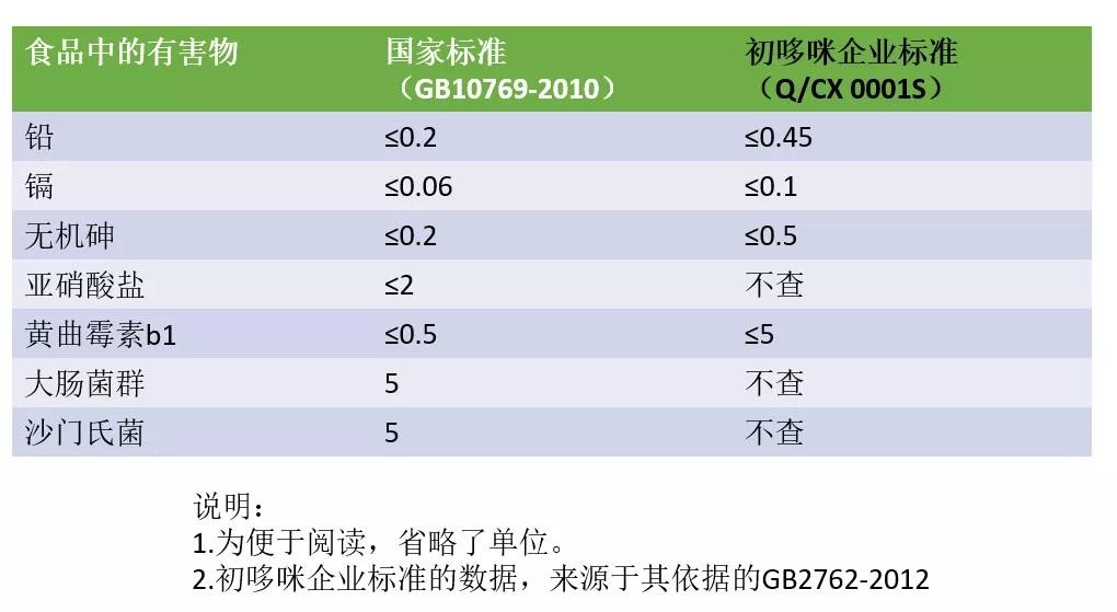 初哆咪宝宝辅食面条没啥营养还罢了,最可气的是食品安全这里。对于需要严格控制的食品中的污染物,初哆咪企业标准,都订得非常宽松!我们做了一个对照表,大家一看就明白: