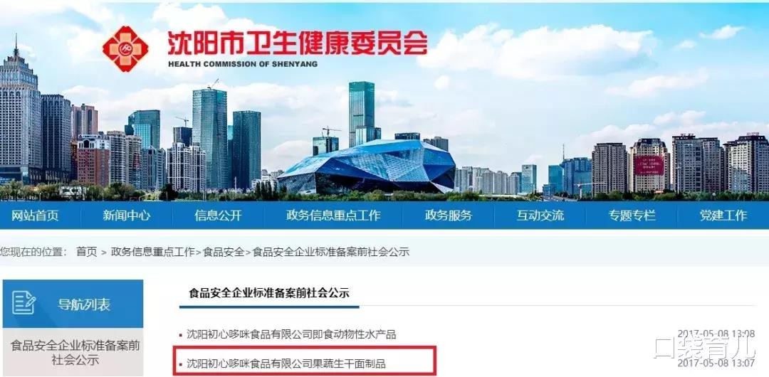 在沈阳卫健委网站就能找到初哆咪的这条企业标准。(注:食品企业自定的“企业标准”,一般会在当地卫健委官网公示)