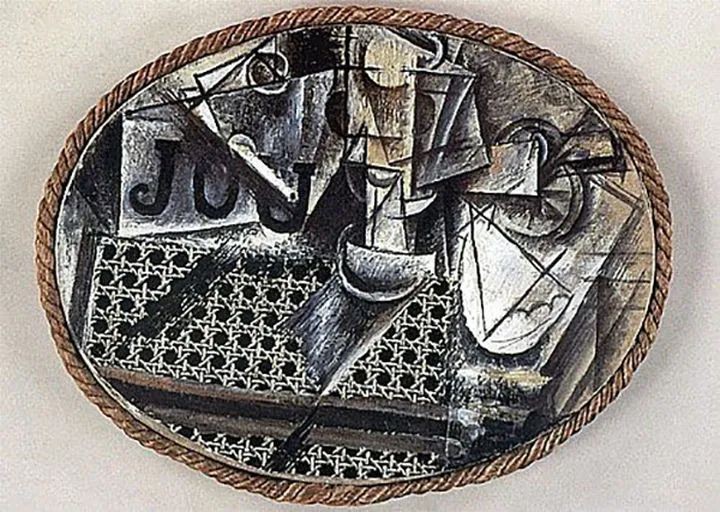 在1912年, 毕加索创作出了第一件较为完整的拼贴画《藤椅上的静物》,他在画布上黏贴了一个藤编, 用实际的藤编取代直接在油画布上画出的藤编图案。