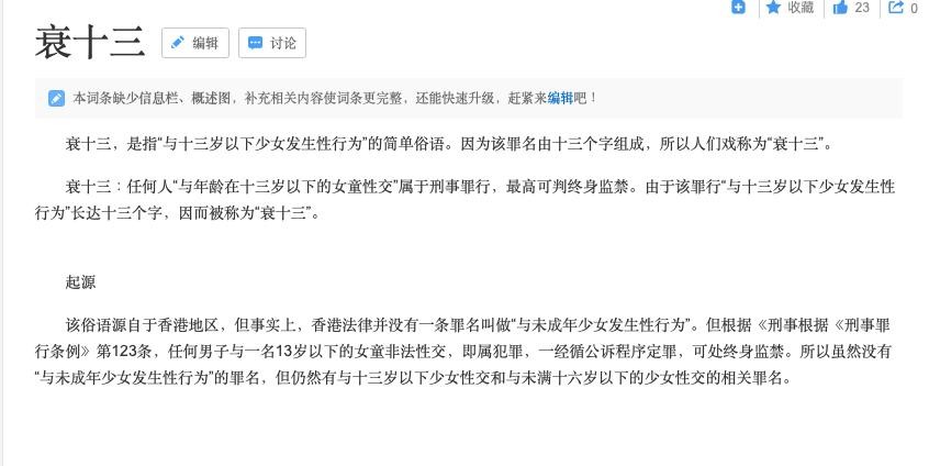 衰十三,是指“与十三岁以下少女发生性行为”的简单俗语。因为该罪名由十三个字组成,所以人们戏称为“衰十三”。根据《刑事根据《刑事罪行条例》第123条,任何男子与一名13岁以下的女童非法性交,即属犯罪,一经循公诉程序定罪,可处终身监禁。
