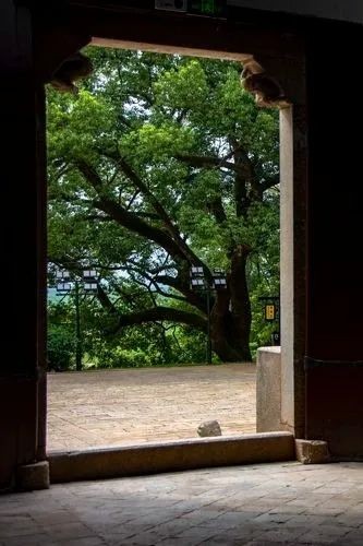 院子里长满了参天古树,郁郁葱葱,青石铺成的院子干净朴素。寺庙的山壁上,屈原沿河而行和怀沙投江的绘画和浮雕早已被岁月的风雨侵蚀得斑驳陆离。