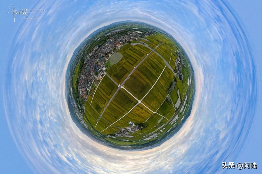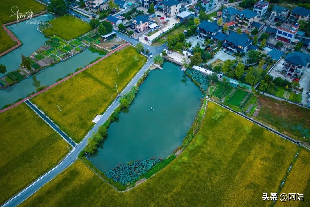 航拍视角下,秋意渐起的田园风光已有青黄交接的颜色,环抱着当地的村落民居和鱼塘沟堑,由数条干净利落的乡间小道串连起来,把杭州特色的田园风景衬托得分外旖旎。