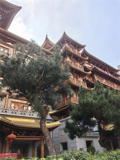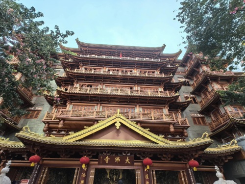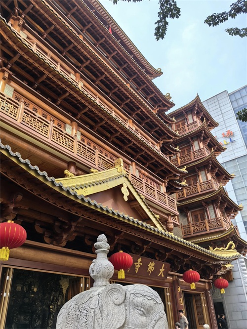 大佛寺被一群高楼大厦环绕,周边是熙熙攘攘的商业街,到处弥漫着现代化的气息。大佛寺在现代化的建筑群里显得特别的突出,大佛寺的建筑风格是中国古建筑风格!