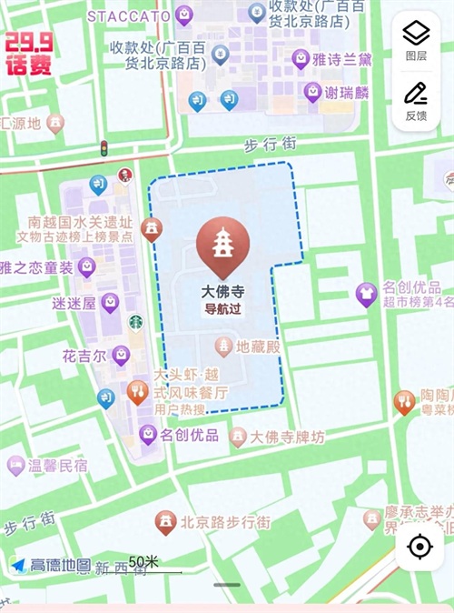 广州大佛寺坐落于广州市越秀区惠福东路惠新中街21号,详细位置在北京路西侧、广百百货北京路店的正南方,在广州北京路步行街里面!