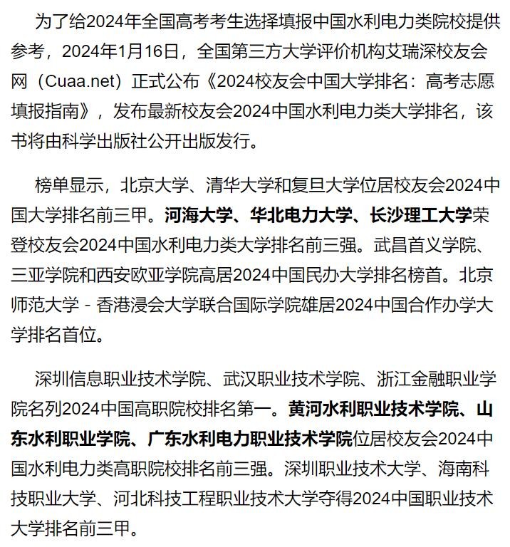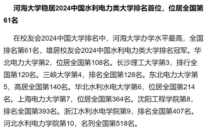 河海大学、华北电力大学、长沙理工大学荣登校友会2024中国水利电力类大学排名前三强。