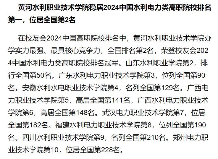 黄河水利职业技术学院、山东水利职业学院、广东水利电力职业技术学院位居校友会2024中国水利电力类高职院校排名前三强。