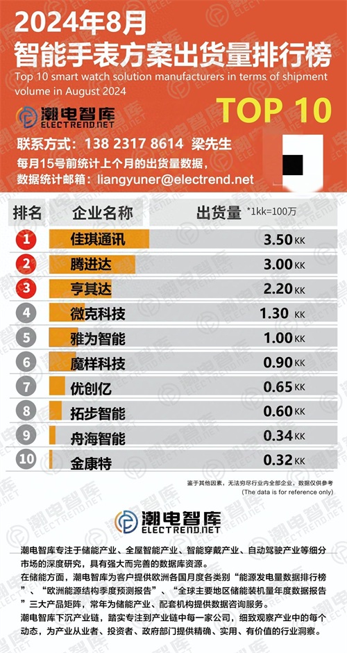 2024年8月智能手表方案商出货量TOP10