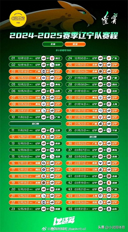 2024-2025赛季,CBA赛程全部出炉,本文内容都是辽宁男篮赛程,图片为辽宁男篮常规赛46场比赛赛程。