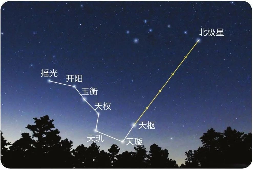 北斗七星是由大熊座的七颗明亮的恒星组成的,在北天排列成斗形,常被当作指示方向的重要标志。北斗七星的中国星名(按照由斗口至斗杓(sháo)连线的顺序)分别为天枢、天璇、天玑、天权、玉衡、开阳和摇光。前四颗称“斗魁”,后三颗称“斗杓”。通过斗口天璇至天枢的连线再延长5倍可以找到北极星。北极星指示的方向便是正北方。