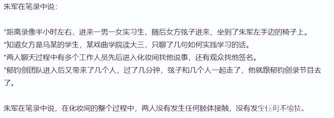另外,在朱军回应之余,该记者的其他调查,也值得放在一起详细揣摩,首先是弦子和朱军两人的笔录,在笔录中,两人的说法迥然不同,弦子表示朱军对其猥亵过程从开始到结束持续了整整40-50分钟,途中,有两位工作人员、两位观众以及郁钧剑和其团队先后进入,每次有人进入,朱军就暂停,人一走就继续。