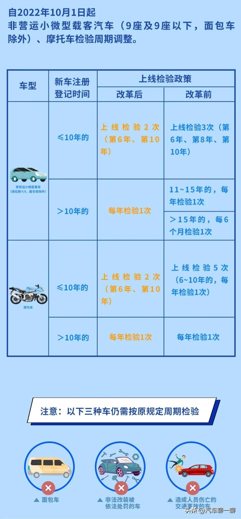 9月15日,公安部交通管理局发表《关于深化机动车检验制度改革优化车检服务工作的意见》,确定2022年10月1日起,我国将全面取消非营运小微型载客汽车(9座或9座以下,面包车除外)15年以上一年两审政策,全面调整为一年一审。需要强调的是,《意见》中指出的汽车年检周期优化,只是针对于9座及9座以下的非营运载客车,其他类型的车了仍旧按照原先年检周期进行年检。另外对于以下这些车辆。也是不适用新规:1、面包车;2、非法改装被处罚的车辆;3、曾经发生过交通事故造成人员伤亡的车辆。