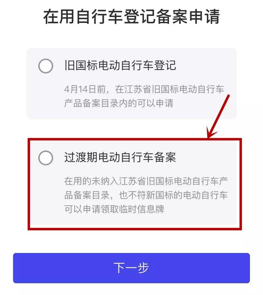 1、前3步不变,第4步时选择“旧国标电动自行车登记”