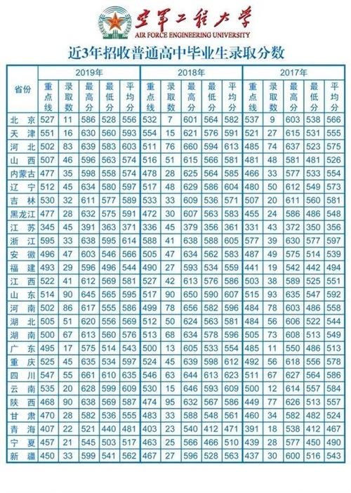 17、空军工程大学2017-2019年在各地录取分数线