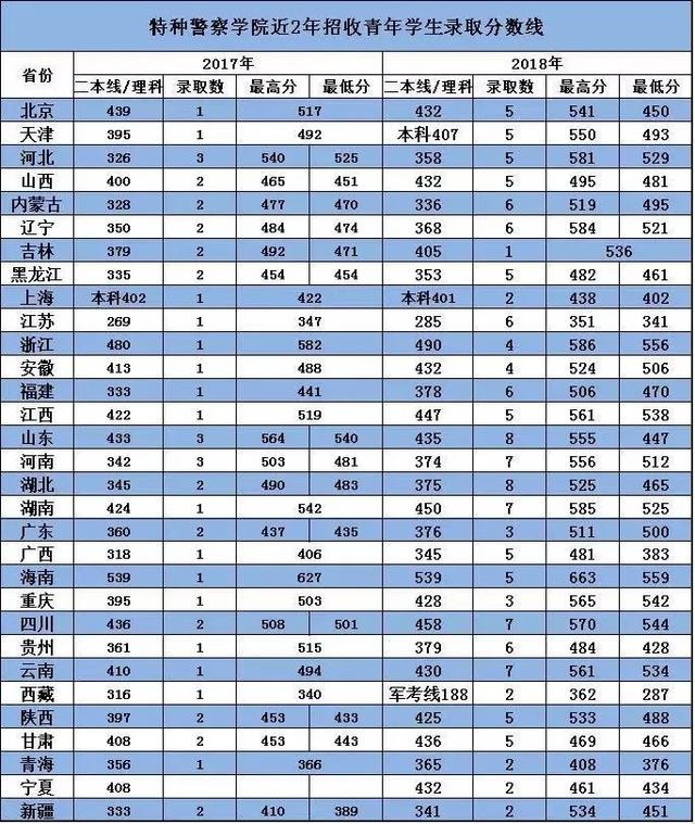 26、武警特种警察学院2017-2018年在各地录取分数线:
