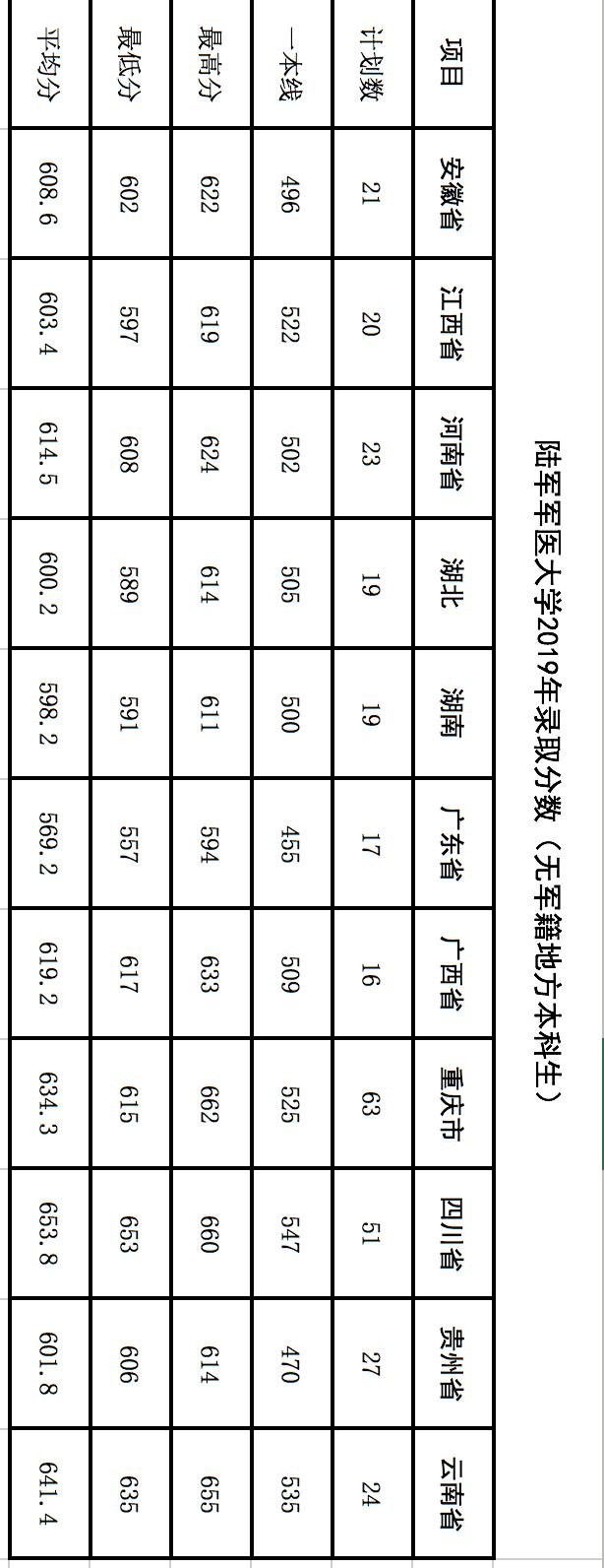 20、空军军医大学(第四军医大学)2018-2019年在各地录取分数线: