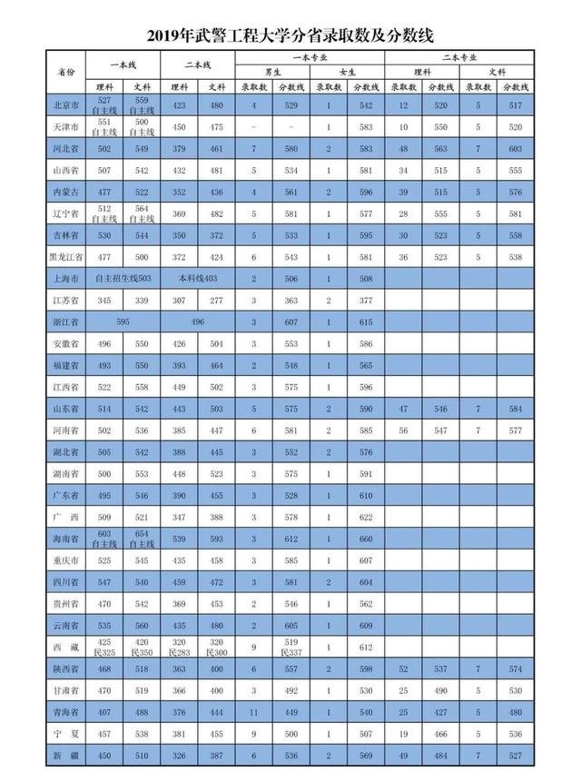 24、武警工程大学2017-2019年在各地录取分数线:
