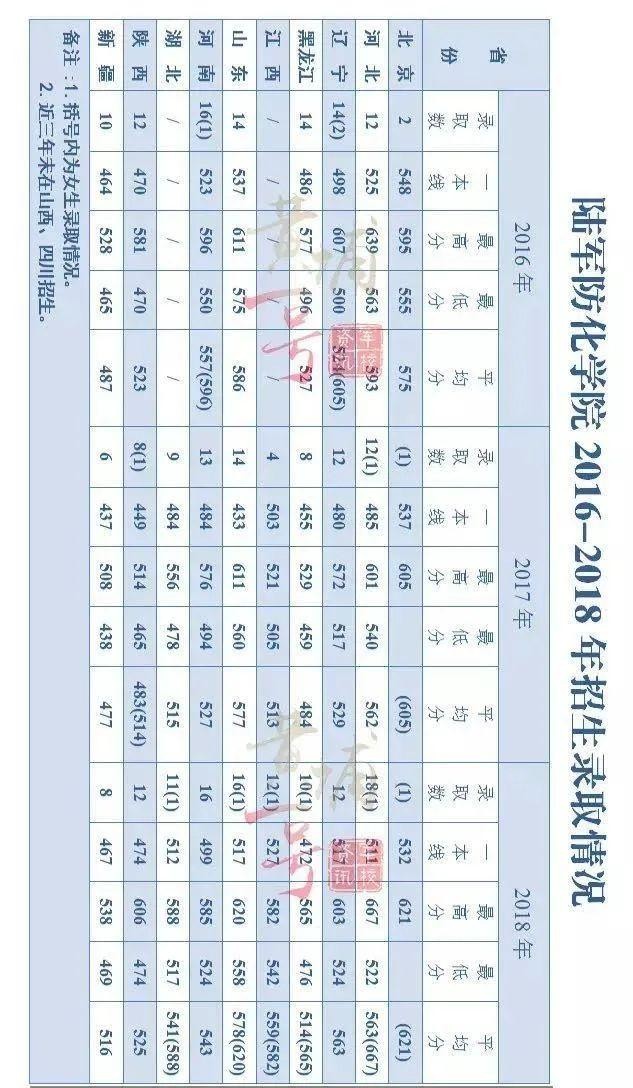 8、陆军防化学院2016-2018年在各地录取分数线