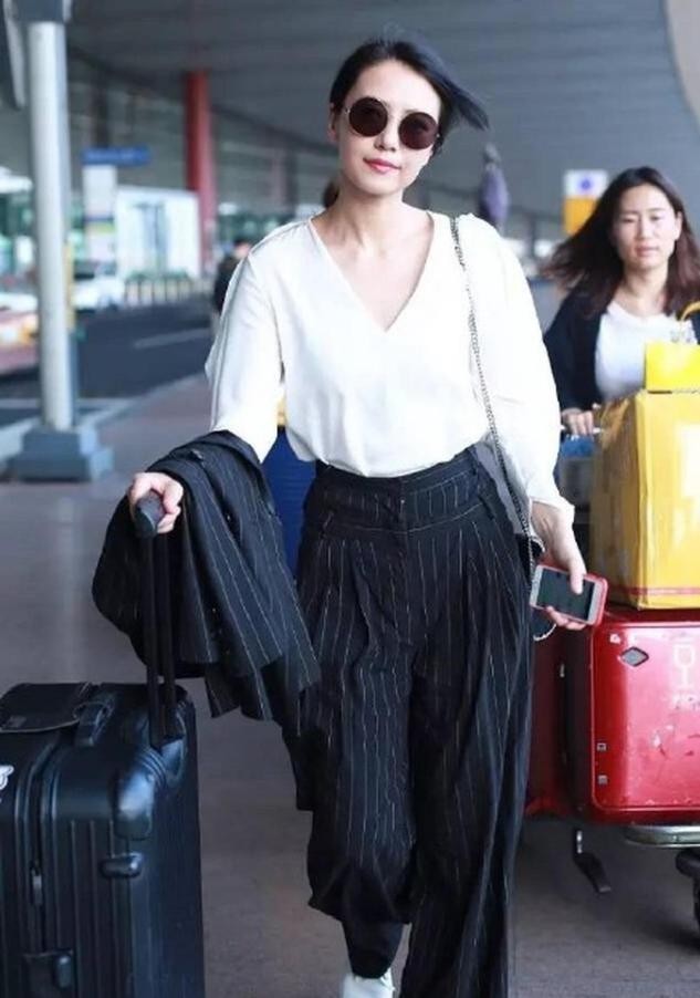 白衬衣搭配藏蓝色条纹裤,这种带点中性风职场感的穿搭高圆圆驾驭的也非常出色。留一头马尾发,身穿V领衬衣配长裤,整套穿搭简洁之余又有种温柔感,白衬衣和藏蓝色西裤的搭配足够质感大气,也不乏柔美感,格外衬托高圆圆的独特气场。