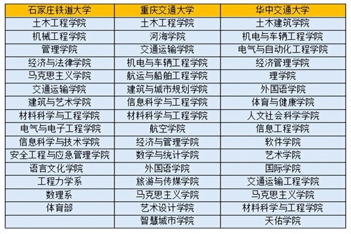 为便于对比分析铁道类、交通类高校办学特色,笔者随机选取了石家庄铁道大学、重庆交通大学、华中交通大学这三所高校作为分析样本。根据官网资料整理,三所高校学院划分门类齐全,涵盖工、文、经、管、法、教育等专业,是典型的综合办学院校。同时,三所高校均设有土木、建筑、电气、信息等轨道交通学科相关学院,可以肯定地讲这三所高校毕业的学生,可以从事轨道交通研发、设计、施工、建设、运维全产业链职业,与湖南铁道职业技术学院、湖南铁路科技职业技术学院办学形成鲜明对比。