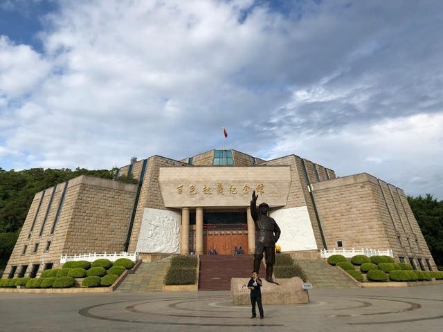 解放街西头穿过中山桥,便是百色起义纪念园。从纪念园西门拾级而上,前行三四百米,为百色纪念碑园。纪念碑园往前走三百多米为右江民族博物馆。右江民族博物馆再向前走一百多米为铜鼓广场、世纪铜鼓楼。铜鼓楼往山下走,是红军桥。越过红军桥,往山上走是邓小平手迹碑林。走到山顶,百色起义纪念馆巍峨矗立其中。