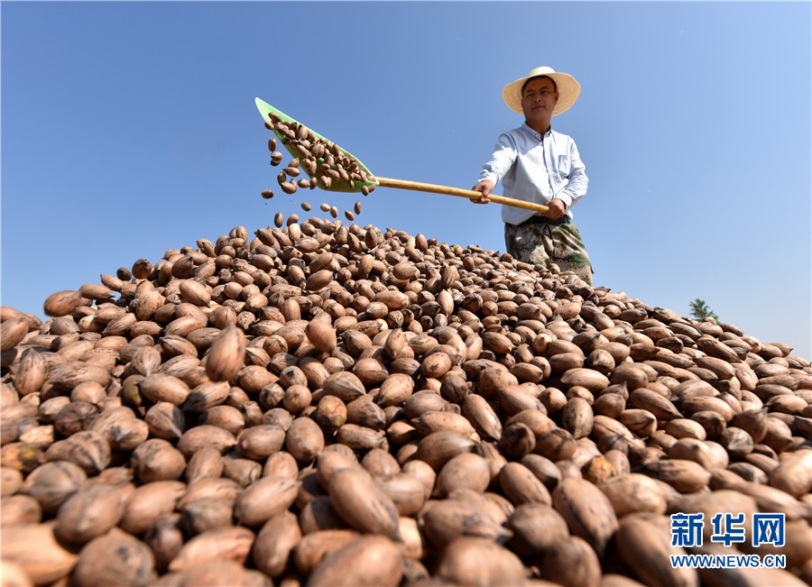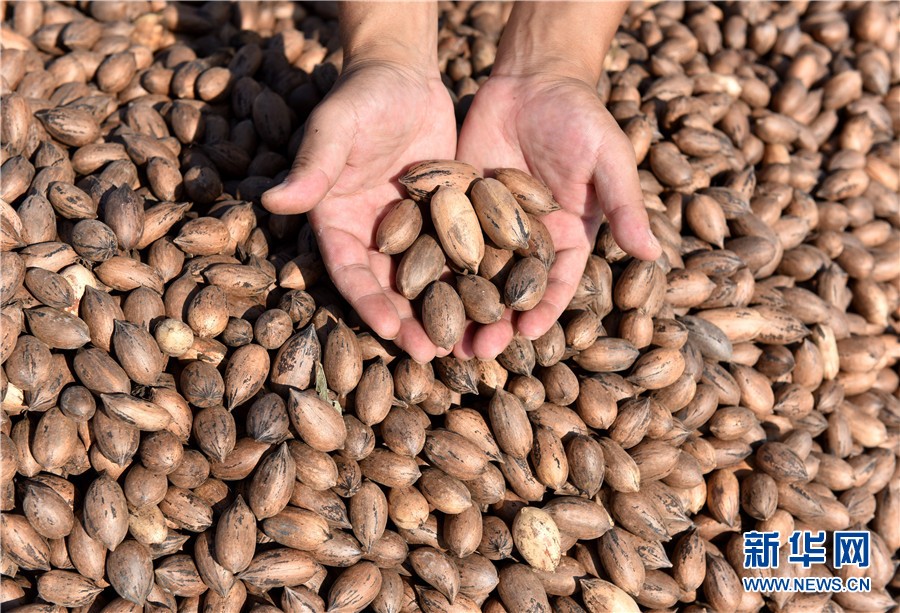 果农正在收集晾晒好的碧根果。