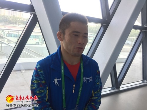 托尔巴图在天津职业技术师范大学体育馆接受乌鲁木齐晚报记者采访。