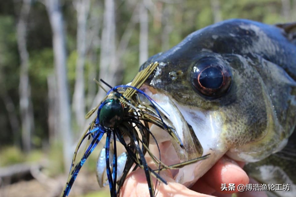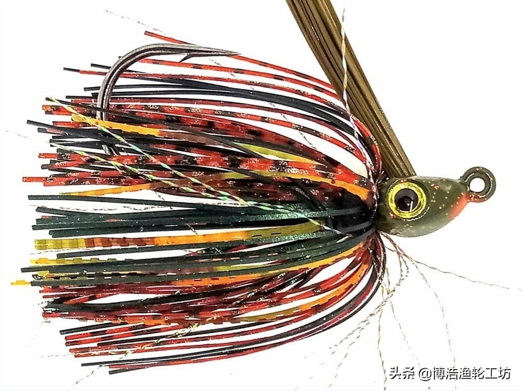 5、Flipping jigs,大的鱼钩和arky风格头部,扁平的香蕉形状和一个沉重的裙摆护罩。这种铅头钩很容易穿过水草,到达鲈鱼藏身之处。定线长荡抛flipping方法,反手将拟饵通过钟摆式轨迹投入近距离钓点,更快速地下沉到钓点,风速较大时更好。