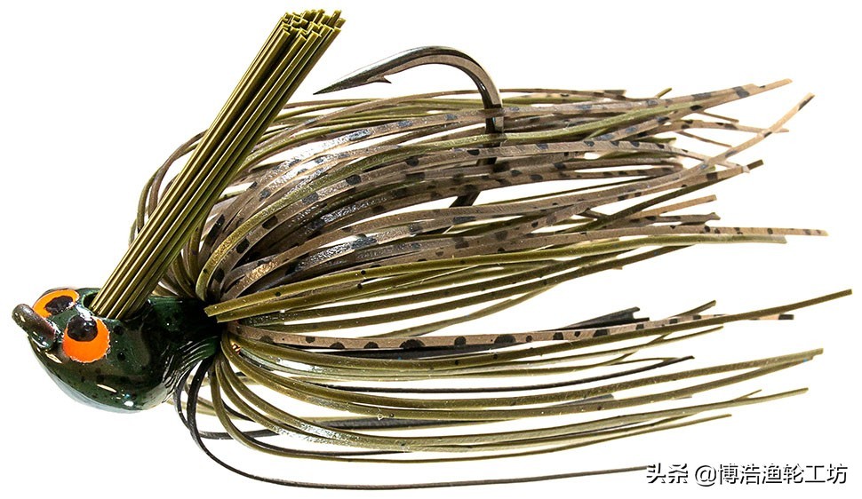 4、游泳型铅头钩,抛投便于游过草丛。(Swim jig: Cast and swim through scattered grass.)流行的铅头钩,头部像游泳的鱼,让它很容易穿过水草。
