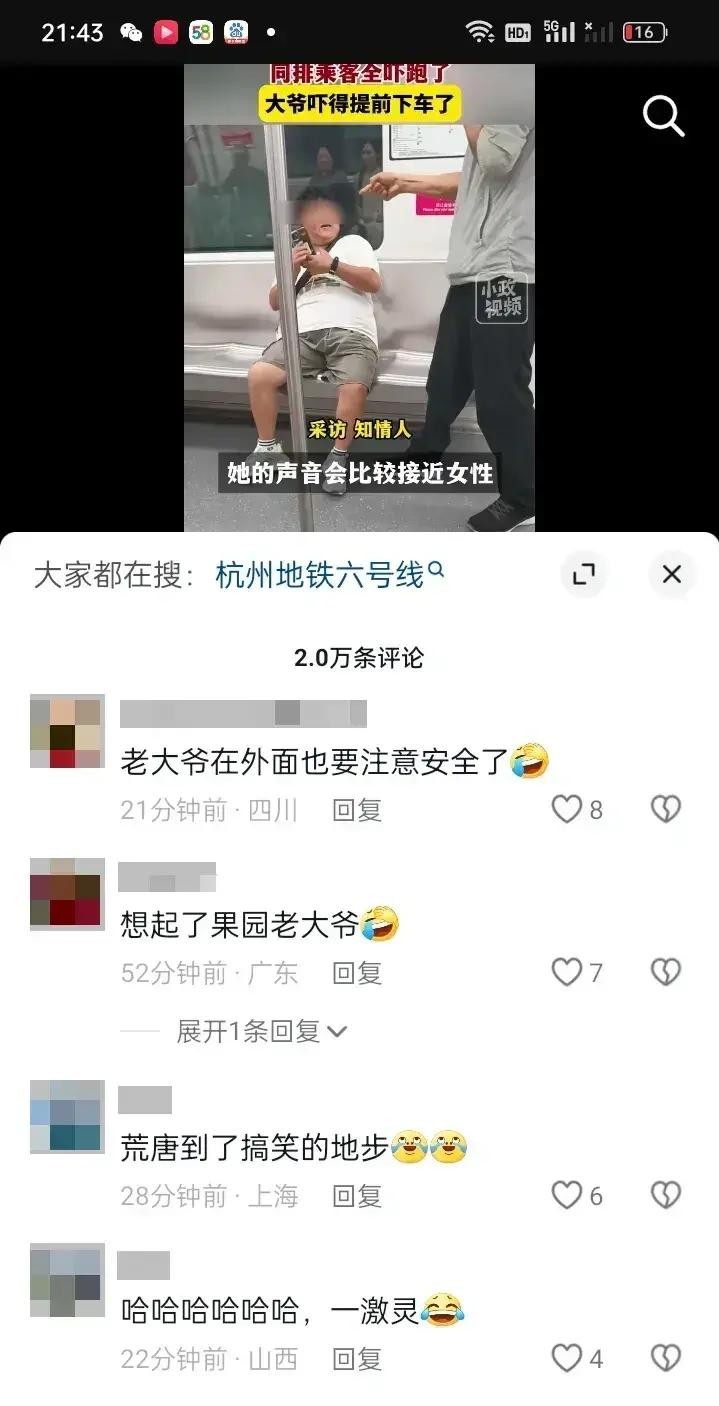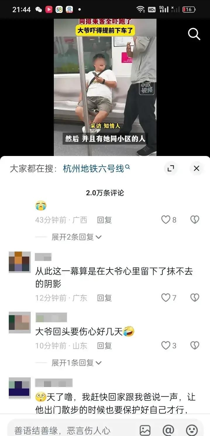 杭州地铁6号线上发生的一幕让人大跌眼镜。一位短发女性居然对老年男乘客上下其手,还振振有词说"让我摸一下嘛"。这位老大爷被迫提前下车逃离,整个过程被其他乘客拍下上传网络。这到底是咋回事?难道现在连老年人都不安全了吗?
