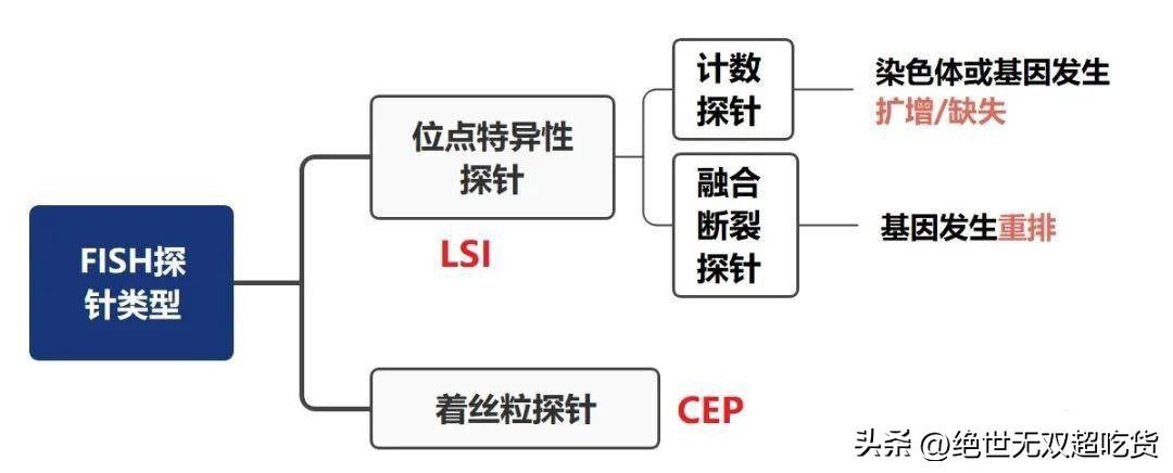 FISH的探针类型大致可分为:着丝粒探针(centromere-enumeration probes,CEP)和位点特异性探针(locus-specific identifier probes,LSI)。