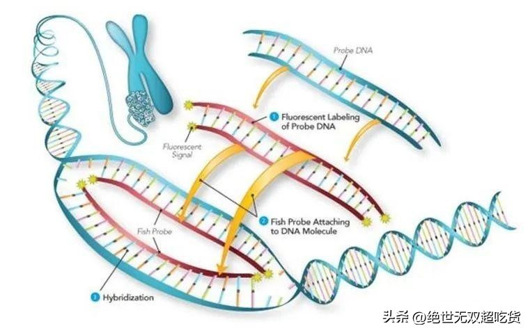 荧光原位杂交技术根据碱基互补配对原则,通过变性复性使带有荧光物质的探针与目标DNA接合,最后用荧光显微镜即可直接观察目标DNA所在的位置。