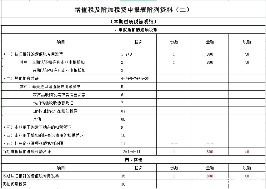 本业务《增值税及附加税申报表》所附材料,本期进项税明细;填写如下: