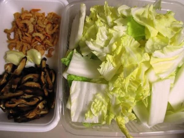 (1) 备料:白菜洗净,切成小片。蒜瓣用刀拍扁。虾米用一点水泡5分钟软化、沥干。干香菇用适量水泡软后切细丝备用。