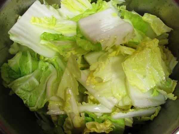 (4) 放入白菜、香菇水、盐和米酒(去虾腥用,可省),盖锅盖焖到白菜出水软化。如果白菜不够甜,另可加少许糖提味。